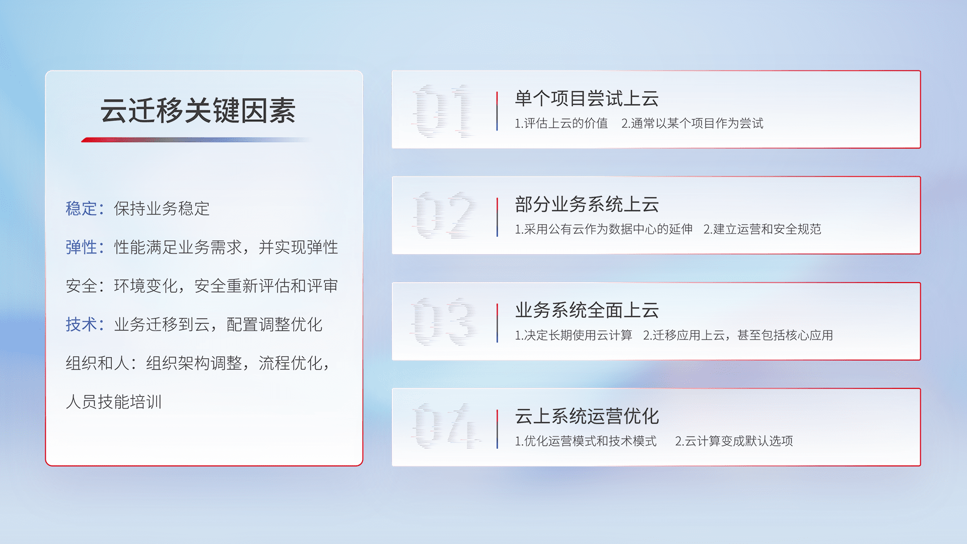 结合实际业务,,,从规划设计、、、、云平台选型、、、、云原生改造、、、、数据迁移、、集成交付,,迁移全过程为客户识别最佳上云路径,,,,做好风险识别管理,,,设计网络架构、、、、身份权限、、、、安全审计合规、、、、操作审计、、日志审计、、、监控告警策略、、、、多站点容灾设计等,,,对云上基础设施进行整体规划,,,提升IT治理水平,,,,以满足弹性、、、高可用、、、、高性能的需求。。。。