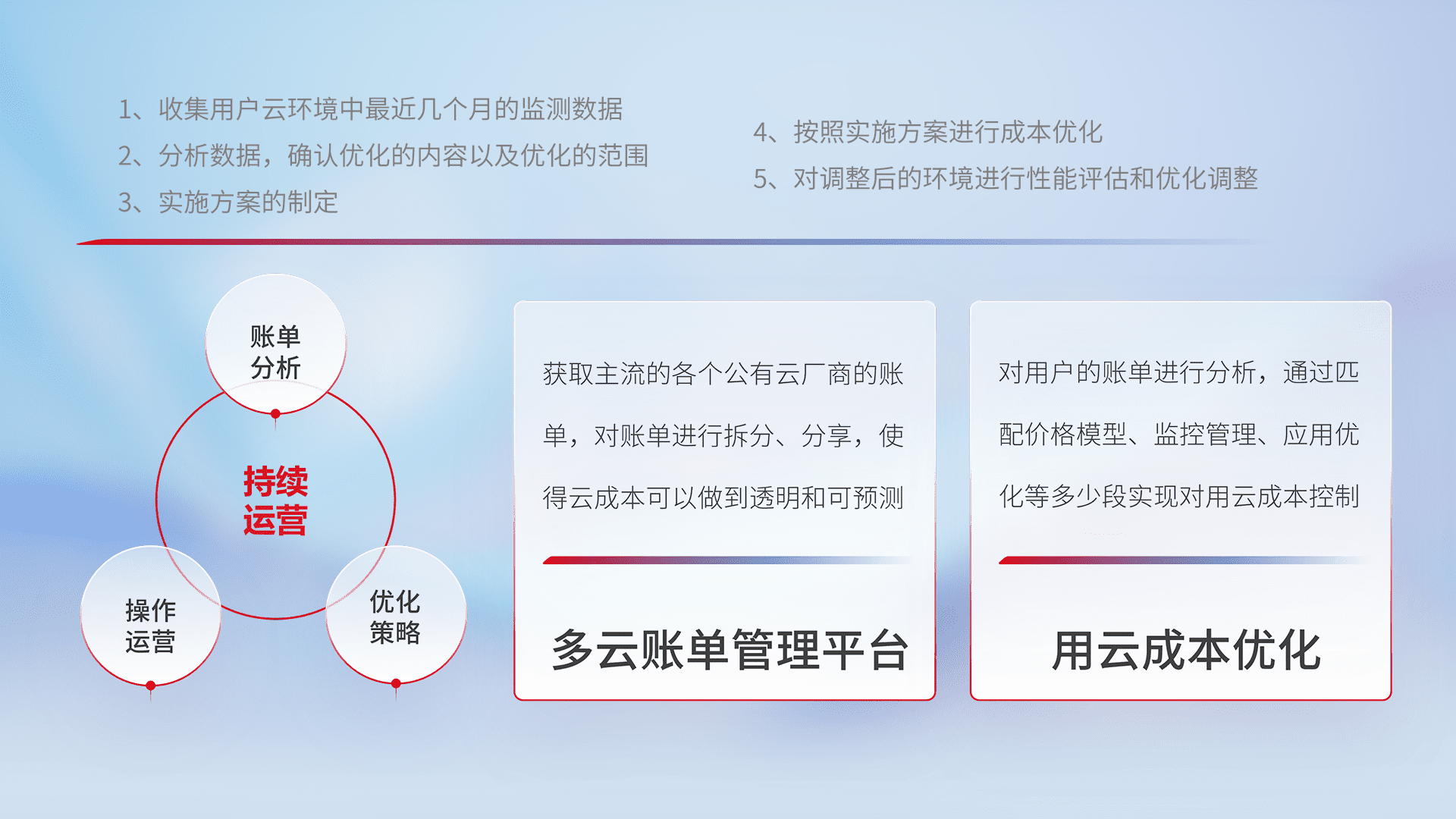 通过多云纳管,,以统一的资源数据模型把客户的云资源进行抽象和封装,,进而实现对多云资源的统一操作,,,,保障云资源管理的可靠性、、、稳定性与可用性。。。量身定制化运维内容,,配置、、、、开发运维、、补丁管理、、、、备份、、、监控、、、认证和访问管理、、审计和日常巡检等,,保障在用云过程中的可靠度,,稳定度以及高可用率。。。。